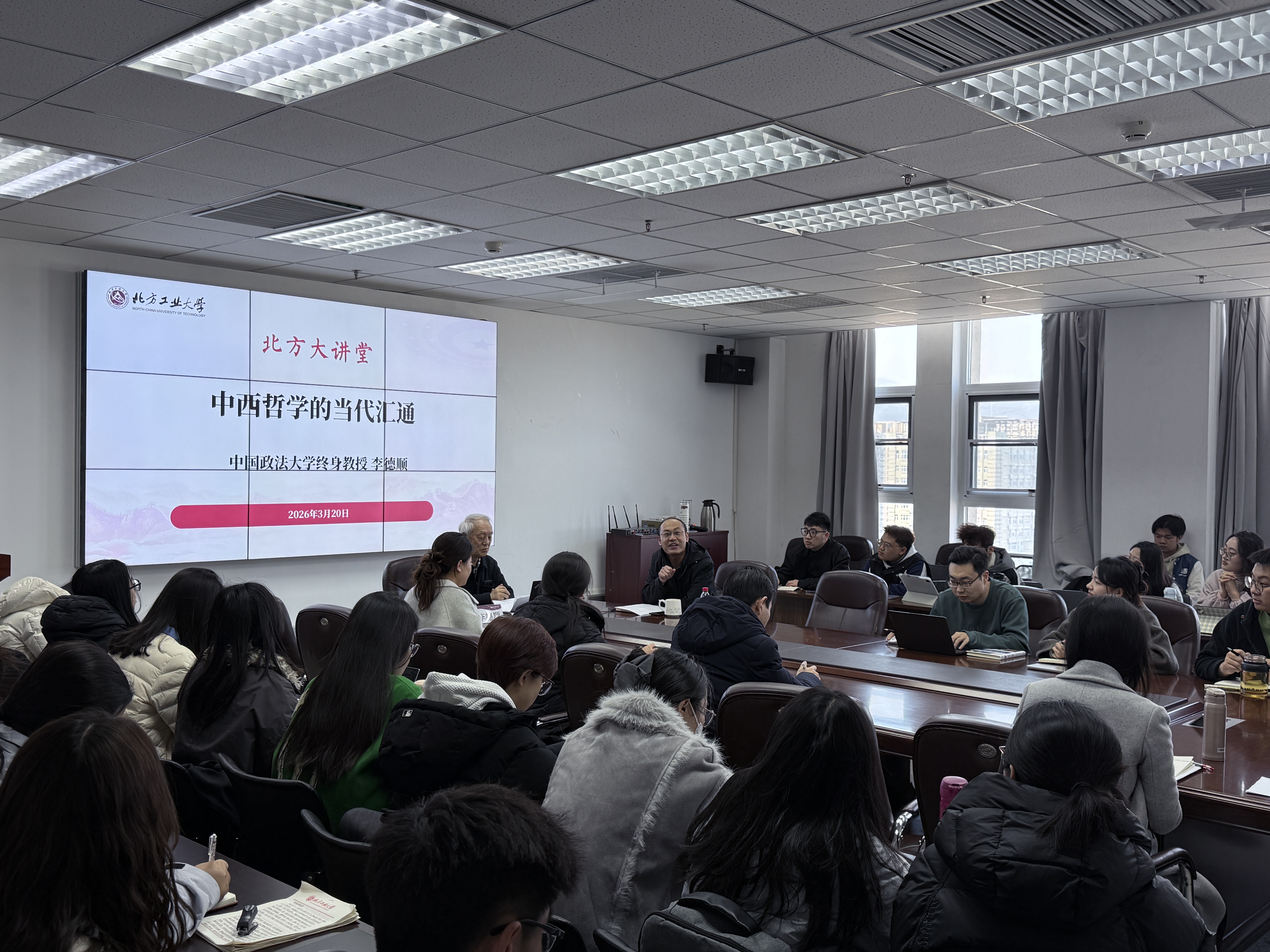 李德顺教授立足马克思主义哲学的发展脉络,围绕中西哲学交流互鉴与马克思主义哲学中国化发展的相关问题进行了系统阐释。李德顺教授强调,推动中西哲学当代汇通,关键在于坚持以实践唯物主义为基础,立足中国实际,面向现实问题,在交流互鉴中汲取思想资源、回应时代课题。李德顺教授指出,学术研究要坚持问题导向,扎根实践、观照现实,不断增强哲学研究的时代性和现实关怀。在交流互动环节,李德顺教授围绕师生关心的学术研究、理论学习和现实思考等问题进行了耐心细致的解答。